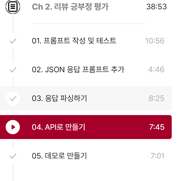이번 강의는 OpenAI의 GPT를 활용하여 리뷰의 긍부정을 판단하는 API 및 데모를 구축하는 과정에 대한 실용적인 내용을 담고 있었습니다. 특히 FastAPI, Streamlit, JSON 응답 처리 등 실무에서 바로 적용할 수 있는 기술들을 다룬 점이 인상적이었습니다.