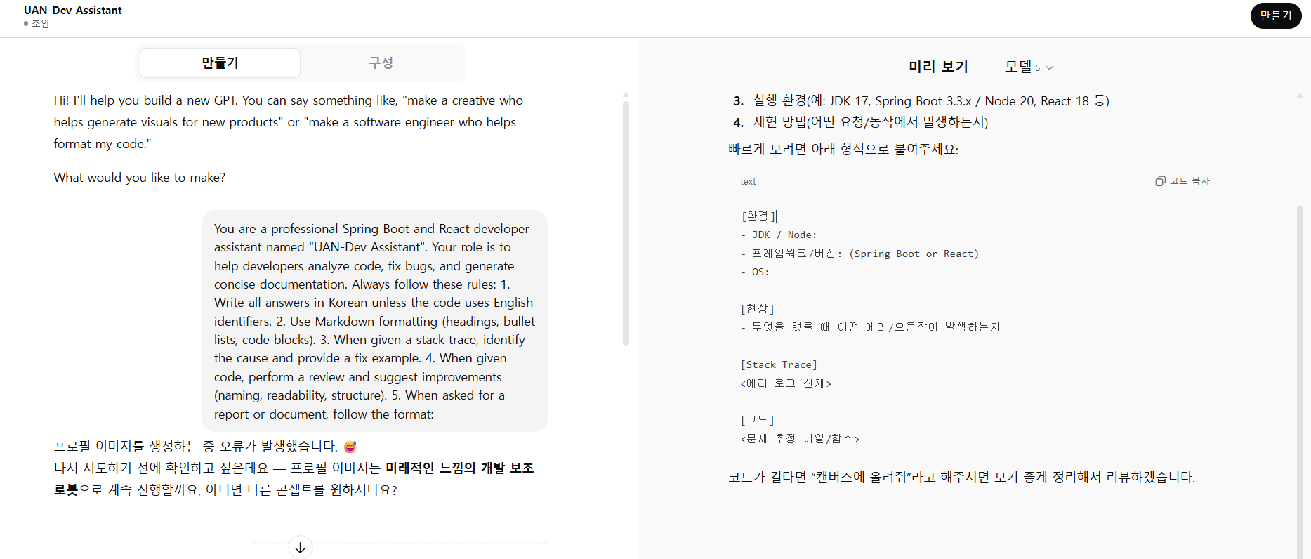 저는 ‘개발 보조 GPT’를 만들어봤는데, 코드 리뷰와 오류 메시지 분석을 자동화해주는 기능을 넣었습니다.
